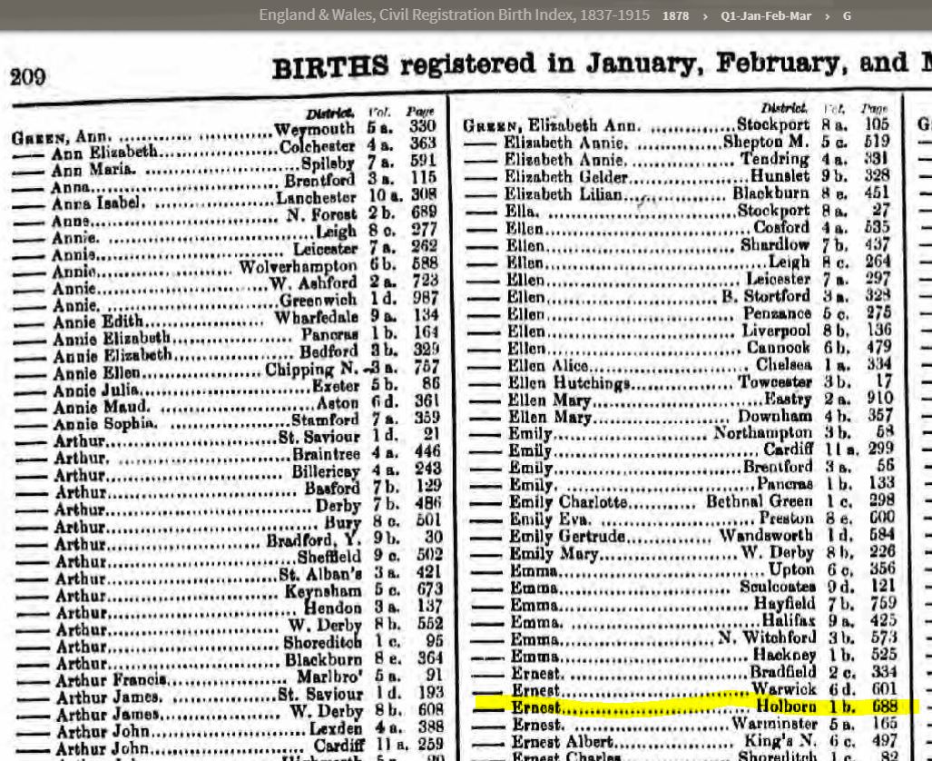 Ernest was the son of Francis Edward Binning. His birth was registered as the son of Amelia Green! Make of that what you will by checking out the family tree link above and the birth links in the footer below.