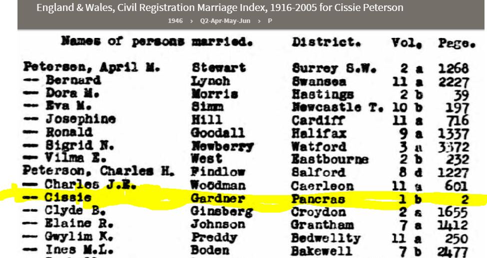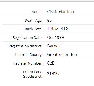 In 1946 Cissie married Ernest W Gardner (This can be seen in the 1939 Register [987], in blue ink) .