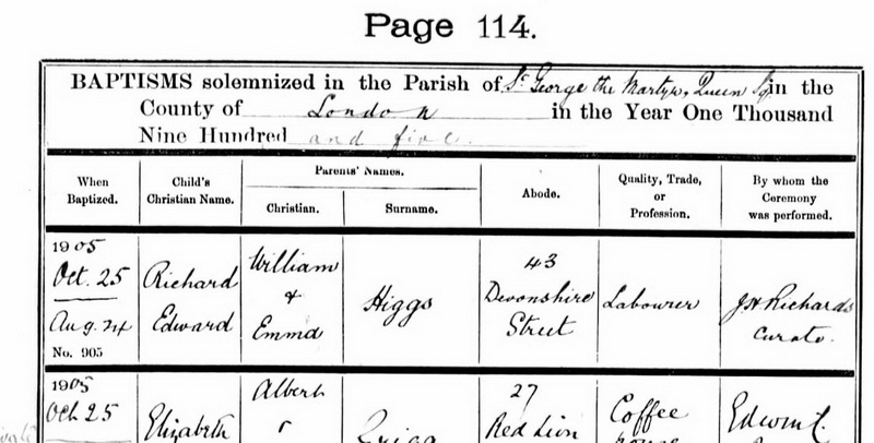 Devonshire Street is south of Regents Park and is today a very expensive area in which to live. In 1905 Willie lived here at number 43 with his second wife, Emma. Here is the Baptism of the second child Richard, who was born the same year. At that time there was also the daughter, Elizabeth [010].1911